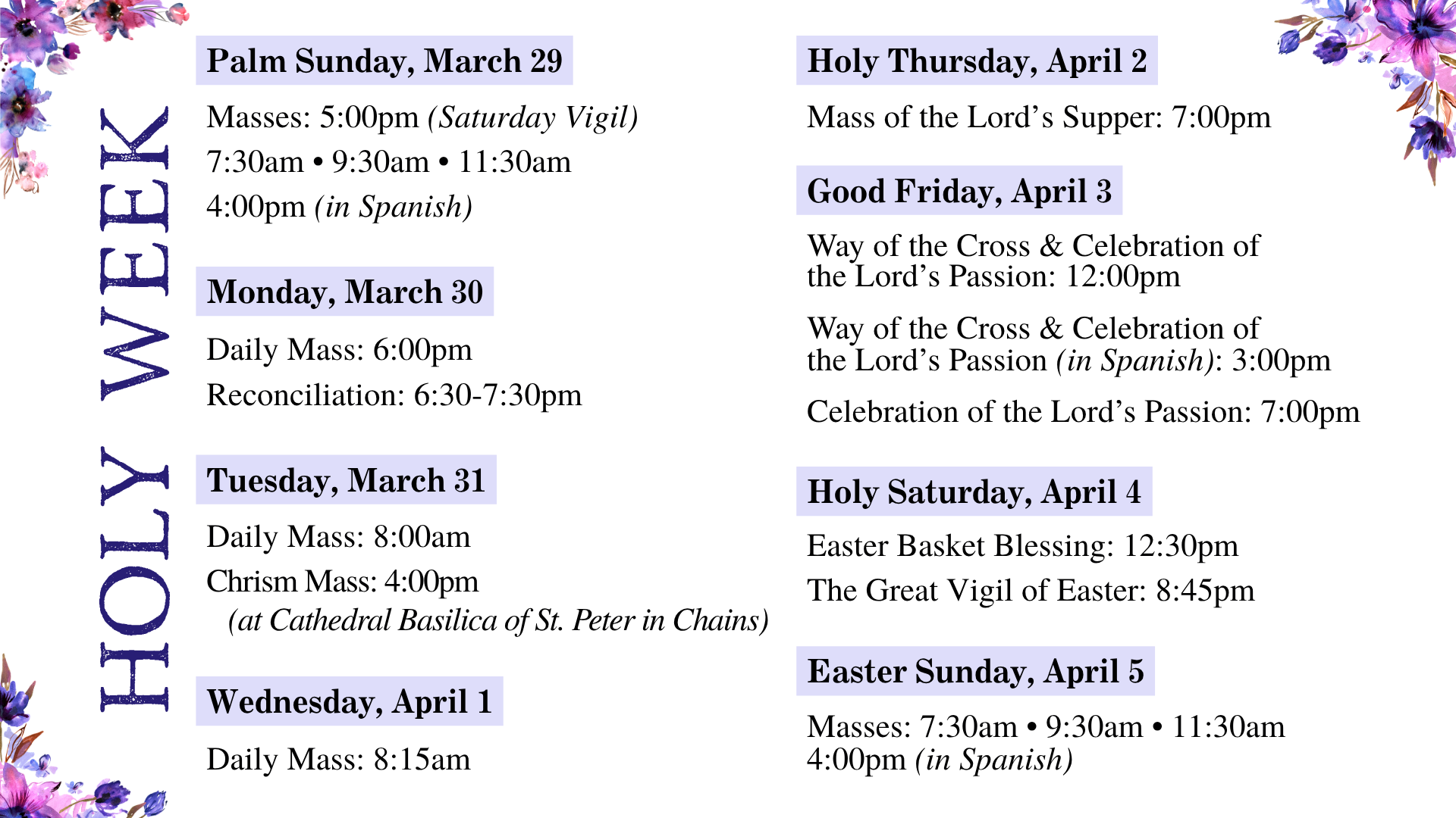 There will be NO Confessions on: Tuesday, March 31st, Thursday, April 2nd, Friday, April 3rd, or Saturday, April 4th